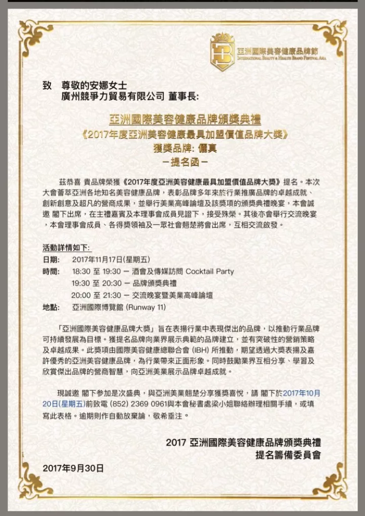 早于九月底儷真品牌就收到了IBH美容健康總聯(lián)合會(huì)邀請(qǐng)函,鑒于儷真品牌在頭皮健康管理、防脫止脫生發(fā)方面在專業(yè)上做出的貢獻(xiàn),提名幾項(xiàng)大獎(jiǎng)。